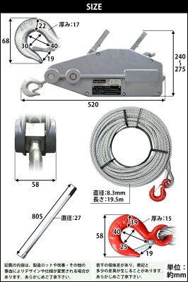 ■総重量:約14kg ・本体:約6kg ・レバーハンドル:約2kg ・ワイヤー:約6kg ■定格荷重:約800kg ■ワイヤー直径:約8.3mm ■ワイヤー長さ:約19.5m ■最大能力:約1200kg ■手動力:341N(35kgf) ■安全係数:ワイヤー/5、本体/4 ■材質:アルミ(本体)、スチール(レバーハンドル、ワイヤー、フック)、ゴム(レバーハンドルグリップ) ■日本語説明書付き ★